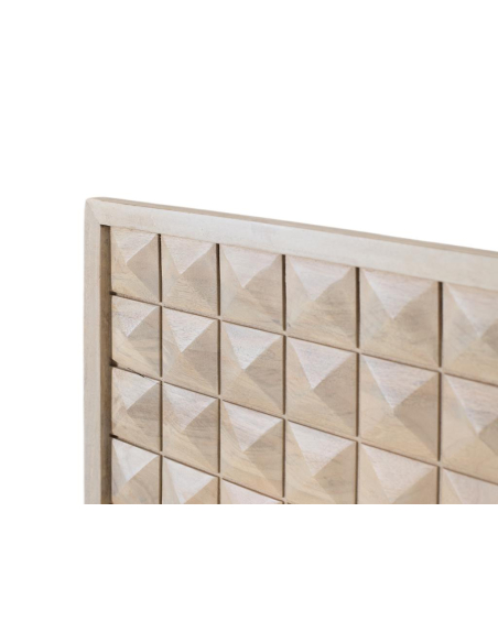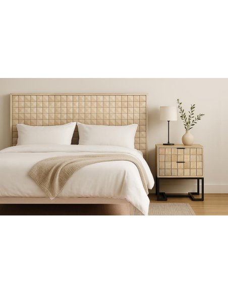 Cabecero Grave natural, su frente geométrico en relieve tipo “tacos/pirámide” crea un elegante efecto 3D que capta la luz y añade textura sin recargar. Es una pieza sólida y atemporal que combina con estilos nórdico, contemporáneo e industrial, y armoniza a la perfección con mesitas y aparadores en tonos madera y metal negro. Ideal para renovar la zona de descanso con un único gesto: coloca el cabecero detrás del somier y verás cómo el espacio gana carácter, calidez y sensación de diseño. Mantenimiento sencillo: limpiar con un paño suave y seco; evitar productos abrasivos y la exposición directa y prolongada al sol o a la humedad.