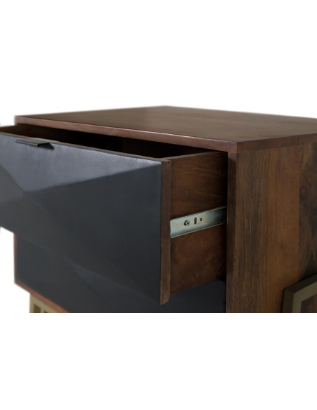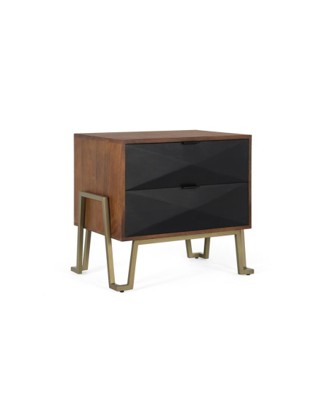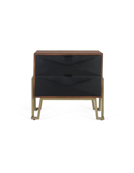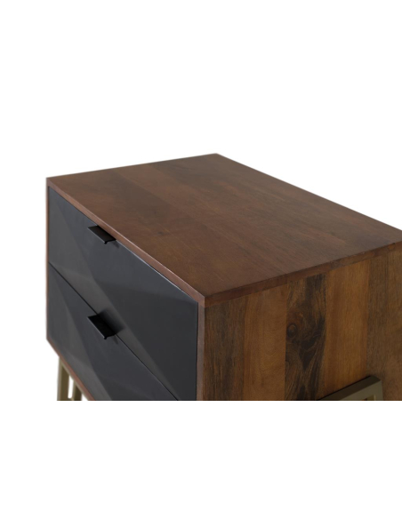 Mesita de noche Prestissimo negro, aporta carácter al dormitorio con su frente geométrico en negro y estructura en madera de mango avellana. Sus dos cajones ofrecen espacio para mantener a mano libros, gafas y dispositivos, mientras las patas metálicas con acabado dorado elevan visualmente la pieza y facilitan la limpieza. El juego de volúmenes facetados y tonos contrastados encaja en decoraciones contemporáneas, industriales o de inspiración boutique. Colócala junto al cabecero de madera o tapizado para un conjunto equilibrado y sofisticado que funciona tanto en dormitorios principales como de invitados.