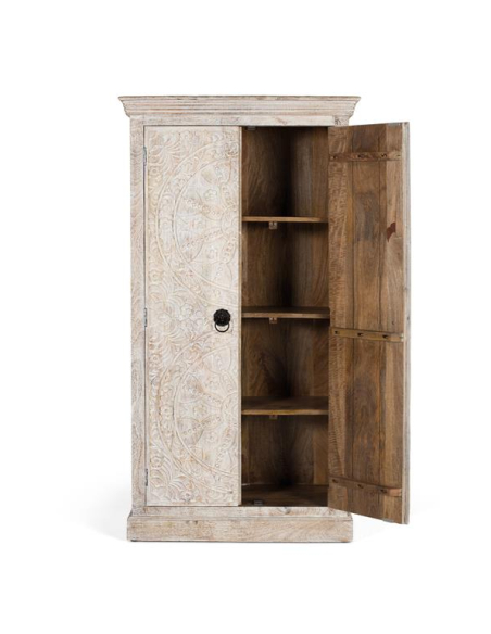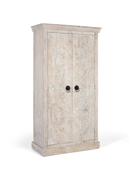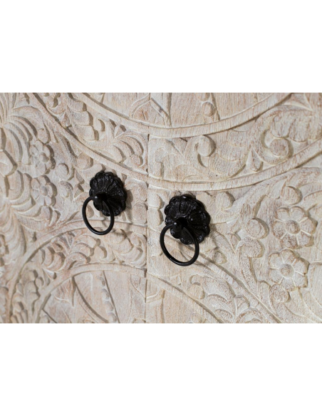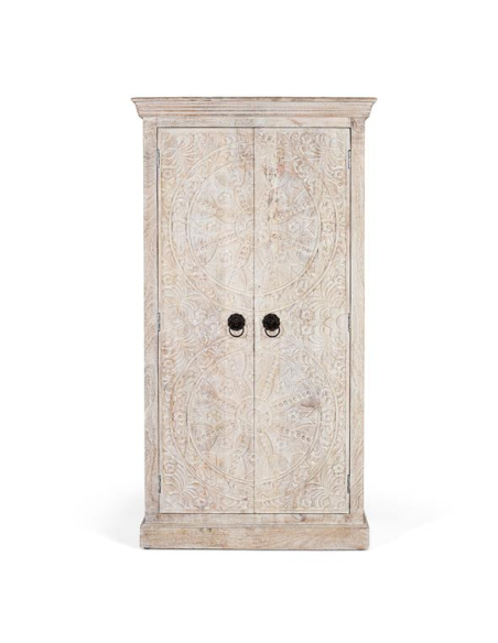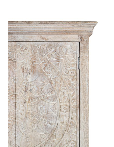Armario Rubato 2 puertas alto, compacto y muy decorativo, el armario bajo Rubato luce tallados florales circulares realizados a mano sobre mango macizo. Su formato bajo lo hace ideal como mueble auxiliar en el recibidor, bajo una ventana o acompañando el sofá, aportando almacenaje oculto en sus dos puertas con balda interior. El acabado arena blanqueado aclara la madera y deja ver la veta, sumando textura y luminosidad a cualquier rincón.