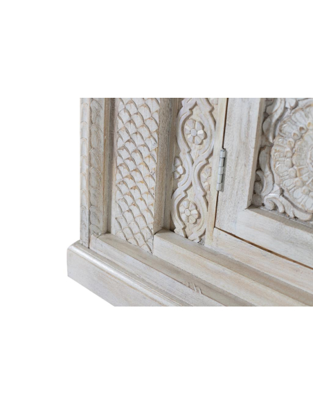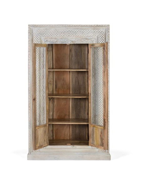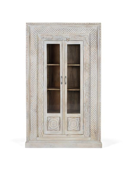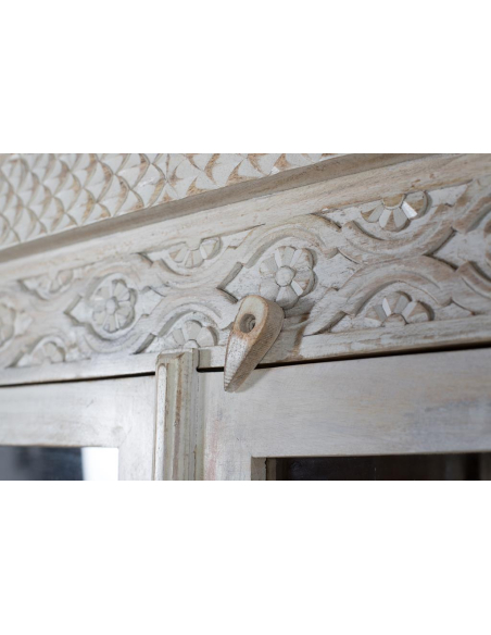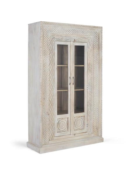 Armario con marco ancho tallado, luce un marco ancho finamente tallado a mano con un delicado acabado natural decapado que aporta luz y carácter. Las dos puertas acristaladas dejan ver el interior y realzan la sensación de ligereza, mientras que las molduras y relieves del frente suman un encanto artesanal difícil de ignorar. Dentro, varios estantes permiten ordenar vajilla, textiles o libros con total comodidad. Funciona como vitrina elegante en el comedor, como mueble de apoyo en el living para exhibir objetos especiales o incluso como guardado en un dormitorio amplio.