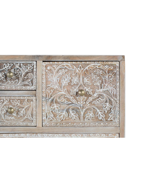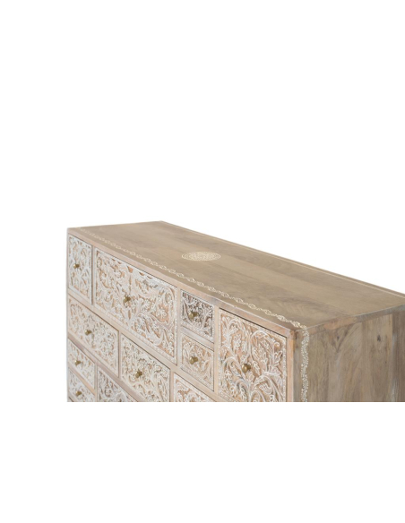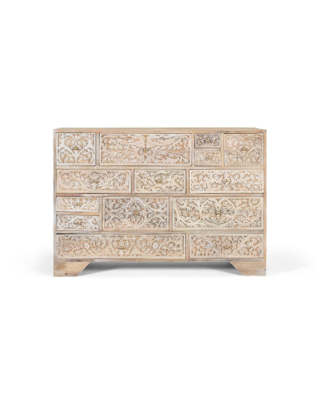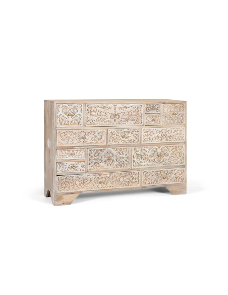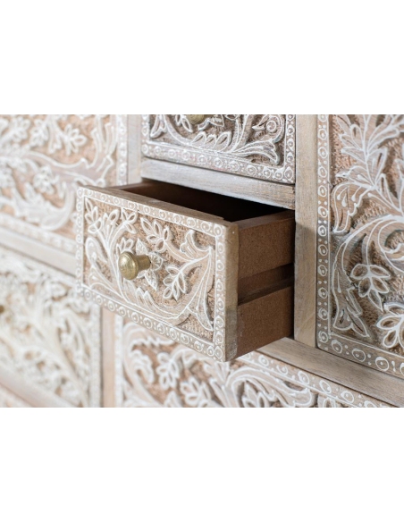 Cómoda Crescendo, destaca por su increíble frente de cajones tallados a mano con delicados motivos florales, rematados en un blanco decapado que revela las vetas de la madera de mango. Su estructura sólida y la disposición de cajones en distintos tamaños ofrecen orden inteligente para ropa, accesorios y textiles del hogar. Es la aliada ideal para dormitorios de estilo romántico, boho o clásico renovado. El relieve artesanal agrega textura y profundidad a la pared, mientras el acabado lavado aporta luminosidad y sensación de amplitud. Una pieza atemporal que combina carácter decorativo y gran capacidad de guardado.