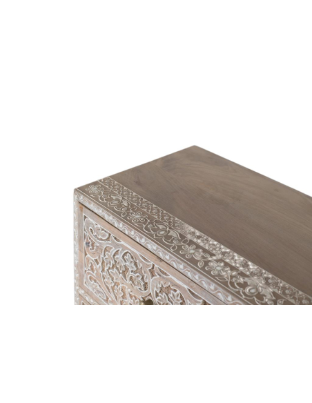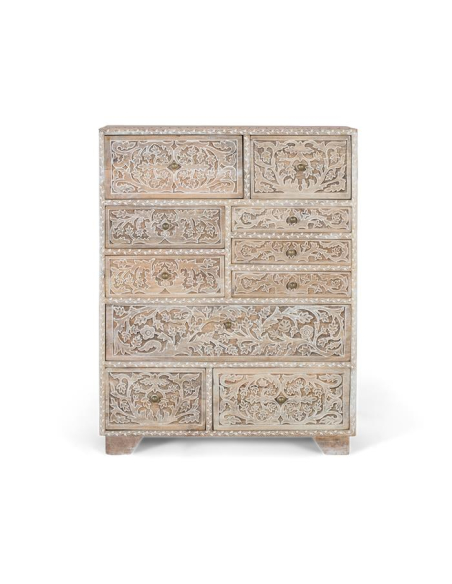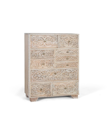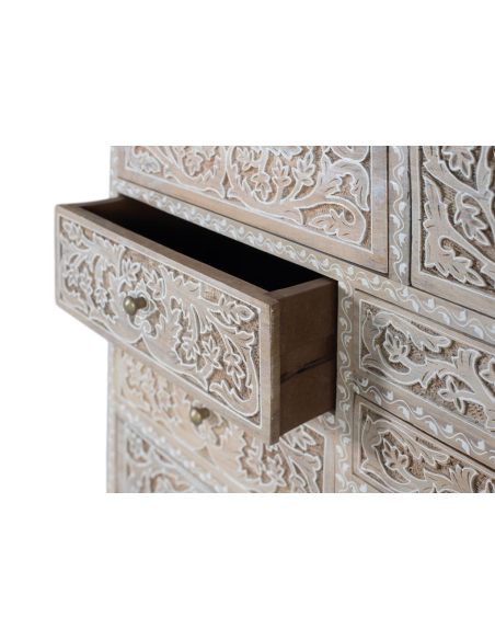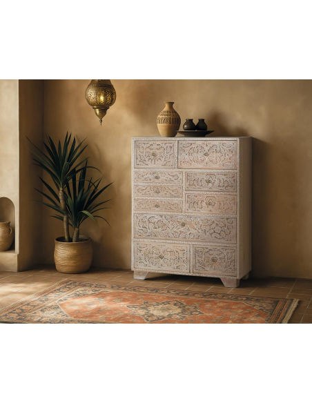 Sinfonier Crescendo, leva el mismo trabajo de talla artesanal a un formato vertical, perfecto para optimizar metros. Realizado en madera de acabado natural, permite apreciar los tonos cálidos y las vetas irregulares que hacen única a cada pieza. Sus múltiples cajones de diferentes alturas mantienen ordenados desde prendas pequeñas hasta documentos, sin perder el encanto del frente labrado. Por su silueta estilizada es ideal para dormitorios, vestidores o pasillos; suma almacenamiento en altura sin ocupar ancho. Combínalo con espejos y fibras vegetales para un look natural y acogedor, o con metal negro para un contraste contemporáneo.
