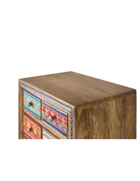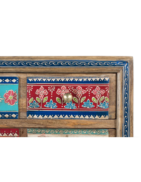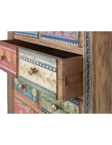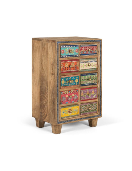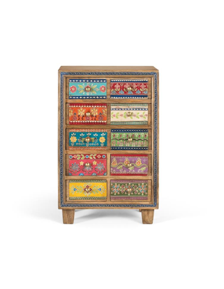 Sinfonier 10 cajones pintados a mano, hecho en madera de mango, este sifonier ofrece diez cajones pintados a mano con diseños únicos: florales, geométricos y arabescos que convierten la pieza en una mini galería de arte. La estructura robusta y los tiradores metálicos garantizan uso intensivo. Perfecto para dormitorios y playrooms, para ropa, accesorios o papelería y como acento protagonista en estudios creativos o recibidores. Su formato compacto se adapta a paredes pequeñas y rincones desaprovechados.