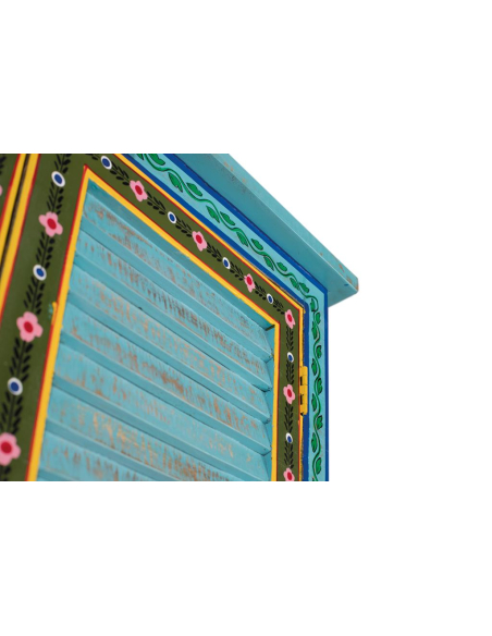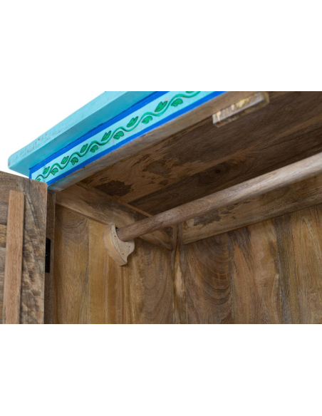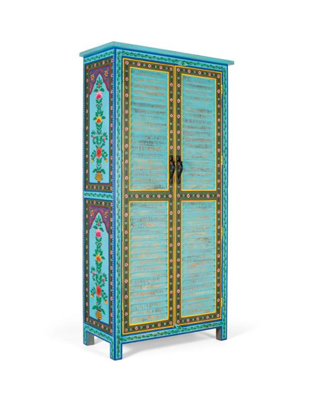 Armario India verde 2 puertas, en tonos azules/verde agua con marcos y cenefas decorativas. Las dos puertas esconden baldas interiores que ordenan ropa, mantelería o vajilla, convirtiéndolo en aliado tanto del dormitorio como del comedor o pasillo. La madera de mango aporta estabilidad y una textura natural que equilibra el color vibrante. Su silueta esbelta entra bien en ambientes medianos y pequeños, aportando toque bohemio y artesanal sin recargar. Combina con fibras, alfombras neutras y luminarias de hierro para un look boho-chic lleno de personalidad.