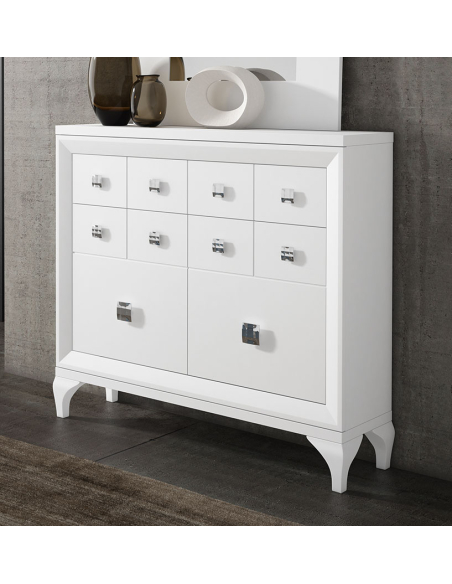 Descubre el nuevo Mueble Funcional Hermes 14 Pata Chippendale, con patas estilo chippendale. Te presentamos un mueble auxiliar perfecto para tu recibidor, salón, dormitorio o zona de paso. Compuesto por dos partes bien diferenciadas. La parte superior consta de un amplio cajón, y la parta inferior es un amplio armario con baldas y dos puertas. Una vez cerrado, este mueble simula tener una composición totalmente distinta, gracias a sus hendiduras falsas en los frentes y los preciosos tiradores que son meramente decorativos. Una solución de almacenamiento de calzado de calidad, que te ofrece los mejores materiales. Elige tus acabados preferidos para frentes y estructura, y escríbenos en el cuadro de texto qué tonos deseas específicamente.