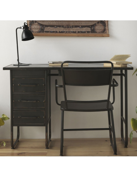 Escritorio Boreal 4 cajones estructura metal, fabricado en hierro con un acabado negro envejecido, presenta un diseño robusto inspirado en los muebles de taller antiguos. Combina una amplia superficie de trabajo con múltiples cajones para una organización óptima. El escritorio cuenta con un bloque lateral de cuatro cajones de diferentes tamaños, perfectos para guardar documentos, material de oficina y accesorios. Un cajón central más estrecho bajo la tapa principal añade espacio extra de fácil acceso. Detalles como los tiradores metálicos y las patas curvadas refuerzan su estética industrial vintage. Perfecto para despachos domésticos, estudios o zonas de trabajo que busquen un estilo único y duradero. Este escritorio Boreal no solo ofrece una superficie cómoda y organizada, sino que también aporta una fuerte personalidad industrial a tu ambiente.