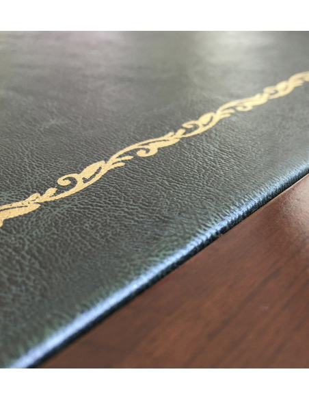 Sin duda, esta cómoda con escritorio secreter Vintage cinco cajones te sorprenderá enormemente por su gran versatilidad. Posee un aspecto de cómoda de dormitorio, y en cierta manera así es, ya que contiene cinco amplios cajones, los dos superiores más pequeños. Lo más sorprendente es su puerta alta con cerradura, que al abrirse nos deja disfrutar de un amplio escritorio con encimera de cuero verde. En la zona interior quedan unos huecos tipo casillero de pequeño tamaño y unos cajoncitos muy reducidos.
