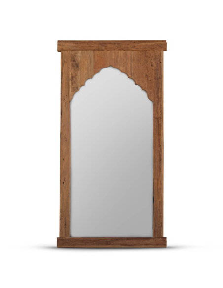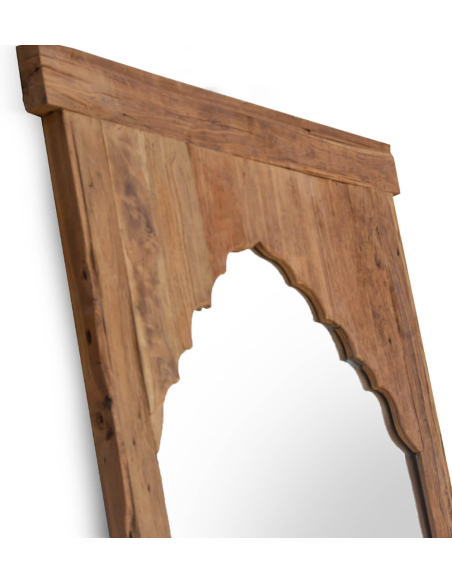Espejo teka reciclada Medina, rectangular con detalles decorativos en la parte superior que siguen un estilo oriental. El diseño es elegante y sofisticado, perfecto para agregar un toque único a cualquier habitación o espacio. La madera de teka aporta durabilidad y un acabado cálido, mientras que los adornos en la parte superior le otorgan un aire de distinción y estilo. Ideal para complementar interiores con un toque de inspiración asiática o rústica.