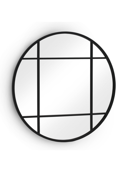 Espejo Estribor redondo diámetro 100 cm, este tamaño versátil lo hace ideal para una gran variedad de espacios, desde el salón sobre un aparador, hasta el recibidor o incluso un baño amplio. Mantiene el atractivo diseño de cuarterones en su marco de metal negro mate, característico de la línea Estribor. Este espejo redondo combina la funcionalidad de reflejar la luz y ampliar visualmente el espacio con un diseño decorativo muy actual. La forma redonda suaviza las líneas rectas de la estancia, mientras que los cuarterones negros aportan un toque gráfico e industrial. Listo para colgar, este espejo es una forma fantástica de añadir profundidad y estilo a tu hogar. Es una pieza equilibrada que aporta carácter sin dominar excesivamente, perfecta para decoraciones modernas e industriales.