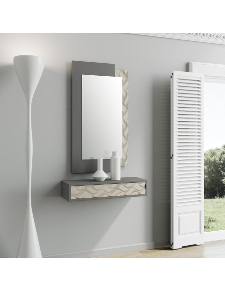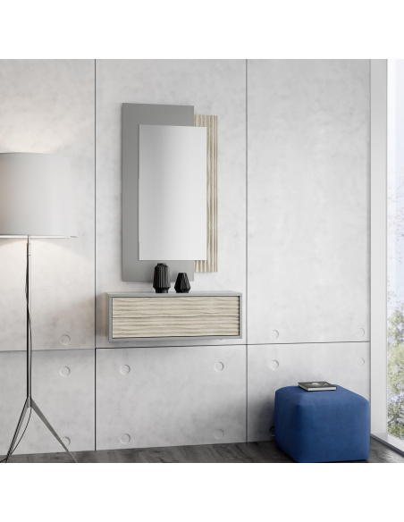 Acabados: Marco del espejo en acabado lacado y detalles frentes en acabados lacados y en chapa madera los frentes marcados como "frentes en todos los acabados".