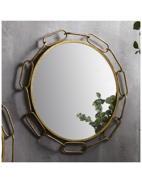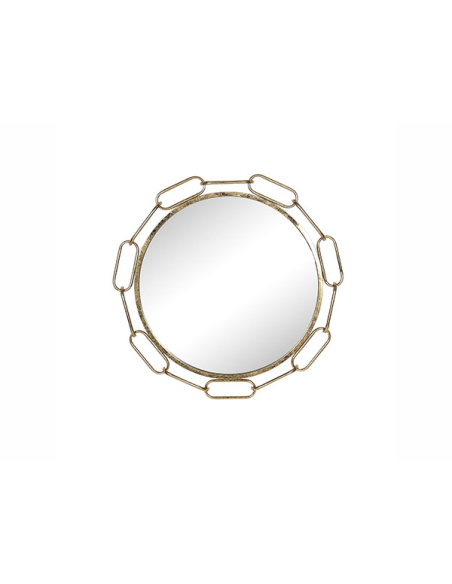 Espejo Cadena metal oro 79d. Este espejo redondo con marco de metal en un acabado dorado y detalle de cadena es la pieza perfecta para agregar un toque elegante y sofisticado a cualquier espacio. Con un diámetro de 79 cm y un grosor de 5 cm, este espejo es ideal para cualquier pared grande.