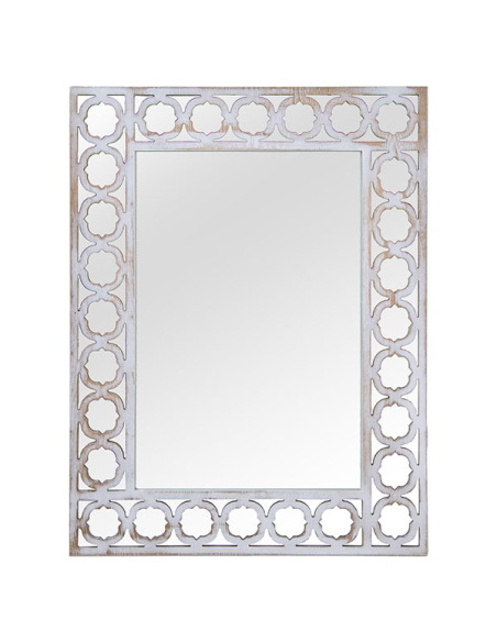 Espejo madera calado dorado y blanco, el marco esta recubierto en listones de espejos y un característico calado en madera en la parte superior. Los espejos en el marco aportan luminosidad y amplitud a los espacios. Este espejo es fácil de colgar ya que viene listo para instalar. Su forma rectangular clásica proporciona versatilidad, permitiéndote colocarlo fácilmente en cualquier habitación, desde el dormitorio hasta el salón. Podrás encontrar mas productos de esta línea en nuestra web.