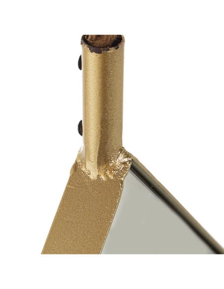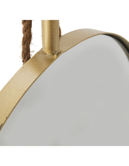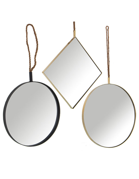 Set 3 espejos geométricos con cuerda, uno con forma de rombo y marco dorado, y otro redondo con marco dorado, todos sujetos por una cuerda rústica. Este conjunto no solo aporta funcionalidad sino también un toque moderno y ecléctico a cualquier espacio. Fáciles de colgar, son perfectos para crear una composición visual interesante en salones, dormitorios o entradas.