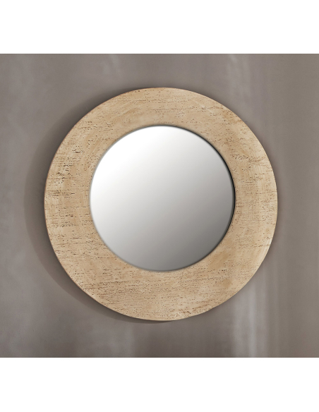 Espejo redondo imitación mármol travertino 80d, es una adición perfecta para cualquier espacio que busque un toque de sofisticación. Con un marco ancho de imitación mármol en color beige, combina un diseño moderno con la calidez de tonos neutros, lo que lo convierte en un complemento ideal para diversas decoraciones. Su ligereza facilita el transporte y la instalación, ya que viene listo para colgar. Perfecto para entradas, dormitorios o salones.