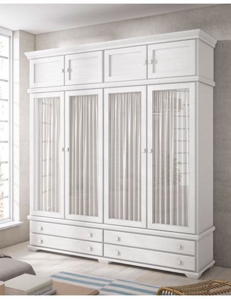Armario Maya dos puertas de 107,5 cm de ancho, 59,5 cm de fondo y 198,5 cm de alto. Posibilidad de pedir altillo para tener más capacidad de almacenaje. Disponible con puertas plafón y con puertas de cristal con visillo. La foto es del armario con altillo.