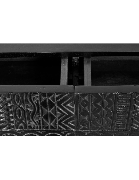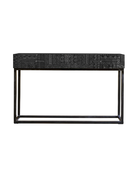 ¿Buscas un mueble original y práctico para conformar la entrada de tu casa? No te puedes perder esta original consola recibidor Jeroglífico, fabricada con la estructura de las patas en metal color negro y parte superior en madera de mango con dos cajones tallados en el frente en color oscuro.