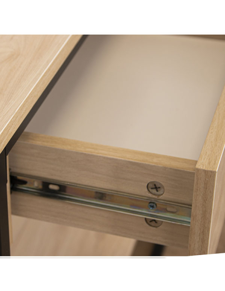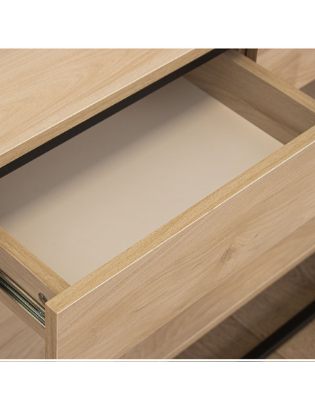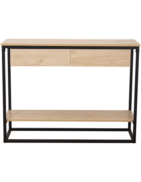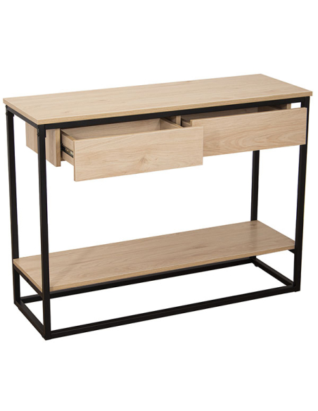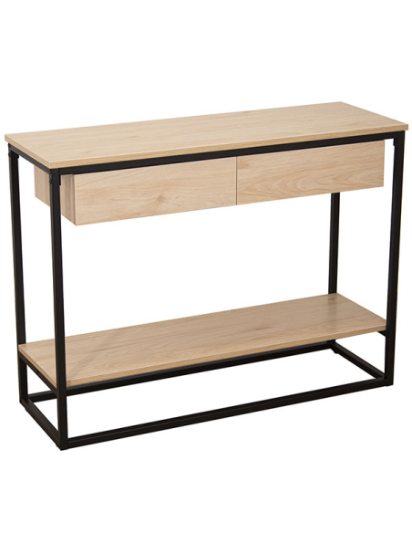 Mesa de entrada metal negro con 2 cajones madera natural. Con su elegante diseño, esta mesa de entrada de metal negro y madera natural añade funcionalidad y estilo a cualquier espacio. Cuenta con dos cajones y una construcción resistente de DM, y sus medidas son de 100X35X75 CM.
