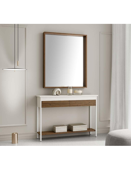 Consola Recibidor cajones y estante modelo Natura. Mueble recibidor con dos cajones y estante inferior fabricado con tableros melamínicos de primera calidad, resistentes al impacto, fácil de limpiar y con propiedades antibacterianas y antivíricas.