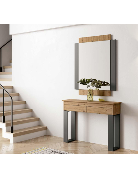 ACABADOS FOTO: Roble Nudoso con patas en Grafito / Espejo: Madera horizontal en Roble Nudoso, madera vertical en Grafito