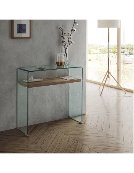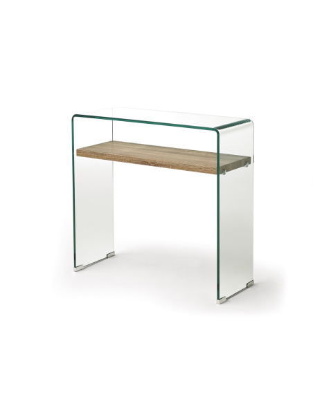 Consola Recibidor CON-11 Sidney cristal y estante. Fabricada en cristal templado con un estante laminado en color roble, esta consola será el centro de atención en la entrada de nuestro hogar. Moderna y funcional es una pieza imprescindible en la entrada de casa.