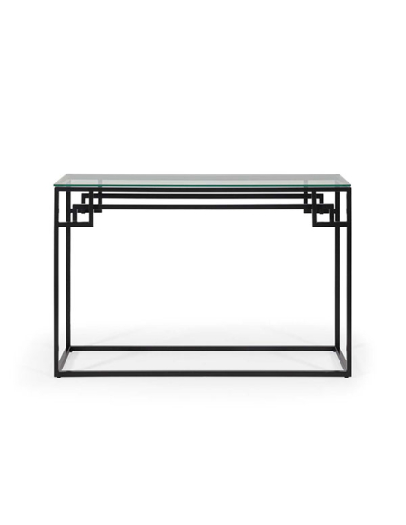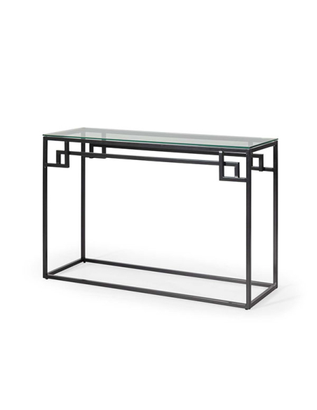 Consola Recibidor CON-13 Tokio negro . Moderna, elegante, funcional, una pieza que no puede faltar en la entrada del hogar. Fabricada en acero color negro formado figuras geométricas en la parte superior del frente y encimera en cristal templado. Una pieza para aportar diseño y modernidad a la entrada de casa.