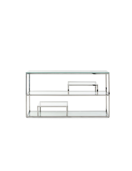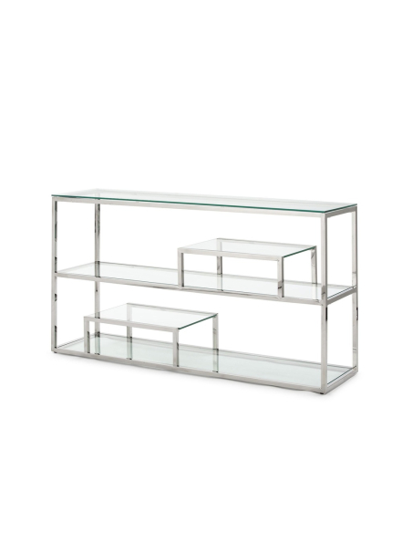 Consola Recibidor Tokio varios estantes de 140 cm, estructura en acero cromado y estantes de cristal templado. Diseño contemporáneo que combina la elegancia del acero cromado con la transparencia y brillo del cristal templado. Es una pieza que seguramente atraerá miradas y realzará el estilo de tu hogar. La estructura en acero cromado proporciona una base sólida y resistente para la consola. El acabado cromado aporta un brillo metálico que complementa perfectamente el cristal templado. Los estantes de cristal templado ofrecen una superficie lisa y brillante para exhibir tus objetos decorativos favoritos, desde jarrones y adornos hasta fotografías familiares. Además, el cristal templado asegura durabilidad y seguridad.
