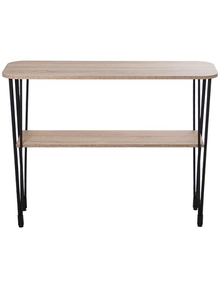 Una pieza sencilla y práctica con la cual decorar la entrada es esta Consola recibidor en madera color roble y patas metal negro para colocarla en la entrada de la casa. Fabricada con las patas en metal color negro y dos estantes en color roble, le dan un aspecto elegante y contemporáneo.
