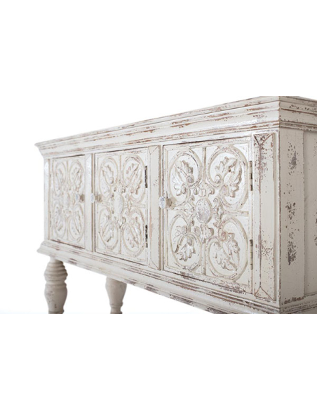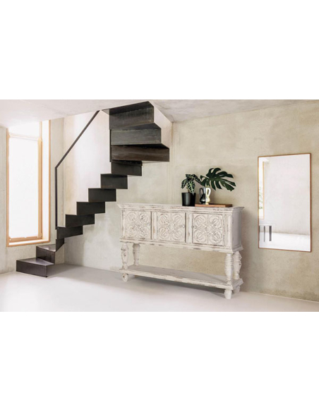 Consola Apure puertas talladas a mano, es una pieza de mobiliario que irradia elegancia y encanto artesanal. Con puertas talladas a mano que exhiben una meticulosa artesanía, esta consola añade un toque distintivo a cualquier espacio. Su estante inferior proporciona espacio adicional para exhibir decoraciones o almacenar elementos esenciales del hogar. Las patas torneadas agregan un toque clásico. Equipada con bisagras de metal, el interior de la consola presenta un cálido color natural, mientras que su exterior está pintado en un blanco viejo que añade un aire de rusticidad y calidez. Ya sea en el pasillo, el salón o cualquier otro rincón de tu hogar, la consola Apure será un elemento central que no solo ofrece funcionalidad, sino también belleza y estilo atemporales. Podrás encontrar mas productos de la línea Apure en nuestra web.