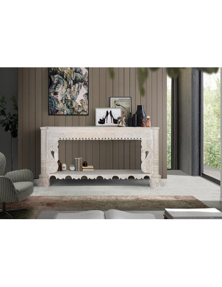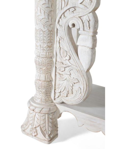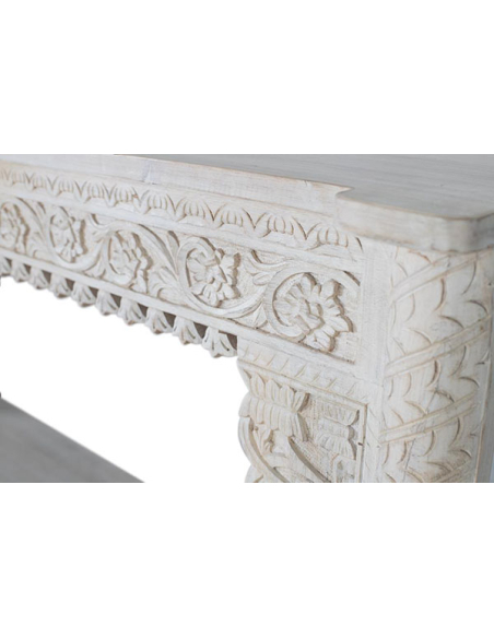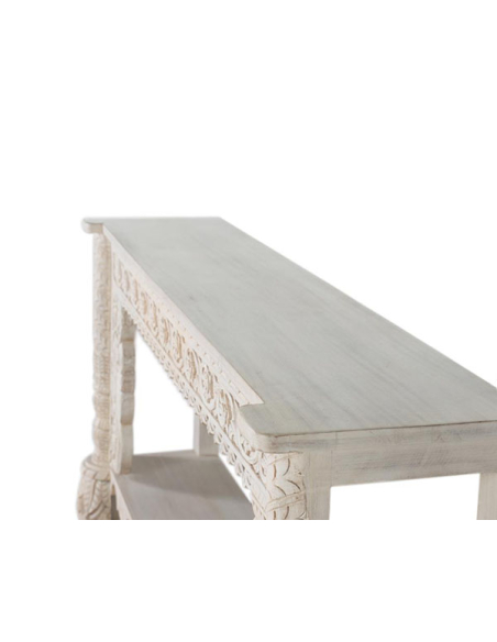 Consola rectangular blanca calada, esta pieza impresionante, de un blanco puro, está bellamente calada con intrincados diseños en el frente, inspirados en la elegancia del estilo oriental. Sus patas torneadas y caladas añaden un toque de sofisticación, mientras que el estante inferior proporciona espacio adicional para exhibir tus tesoros. Perfecta para añadir un toque de exotismo y elegancia a cualquier entrada o sala de estar.