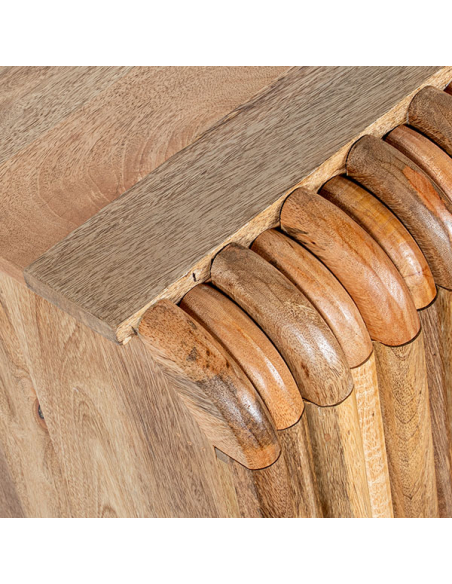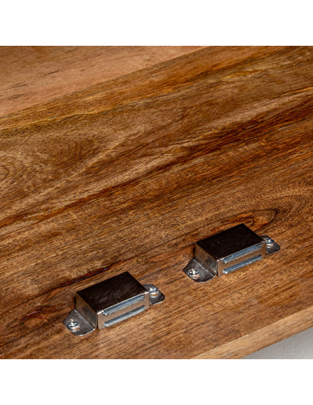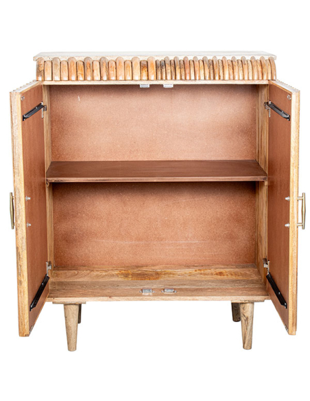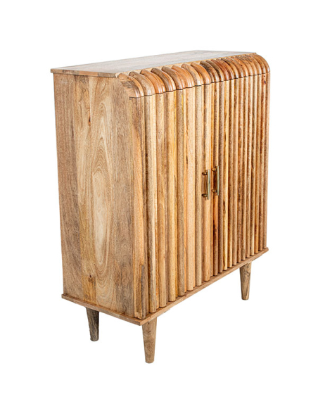 Mueble de entrada Marwari 2 puertas, construido con madera de mango y patas de metal curvas colocadas en los laterales, es una opción elegante y funcional para tu hogar. Con dos puertas que presentan varillas horizontales en el frente y los laterales, este mueble ofrece un diseño natural y moderno. Los tiradores verticales de metal y las puertas con bisagras metálicas y cerramiento imantado aseguran un acceso fácil y seguro a la balda interna, ideal para almacenar y organizar tus objetos. El acabado en color natural permite que las vetas de la madera sean visibles, aportando calidez y estilo a tu entrada.