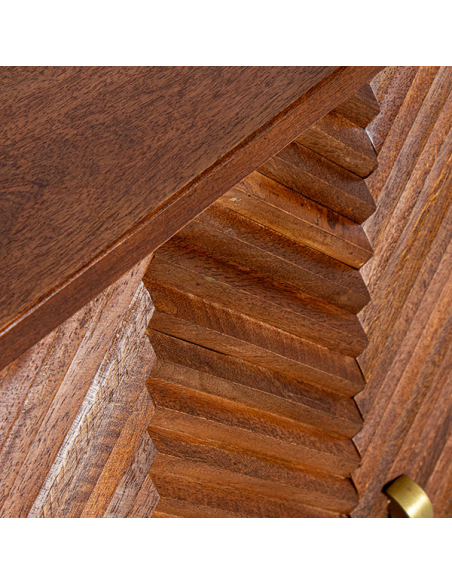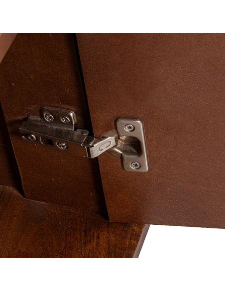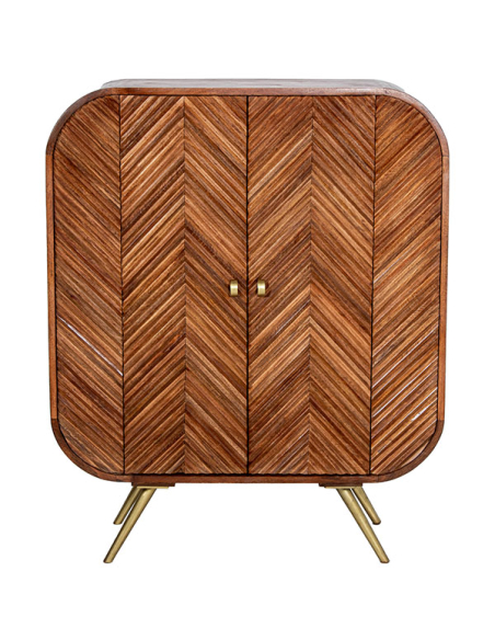 Mueble de entrada Brumby 2 puertas, construido con madera de mango y patas de metal elevadas, presenta un diseño rústico con un toque de sofisticación. Las dos puertas con relieve de varillas en diagonal muestran los colores marrones y rojizos de la madera, mientras que los tiradores curvos de metal dorado añaden un toque de elegancia. Las puertas, equipadas con bisagras metálicas y cerramiento imantado, se abren para revelar estantes internos que ofrecen un amplio espacio de almacenamiento. Este mueble es perfecto para entradas que buscan una pieza distintiva y funcional.