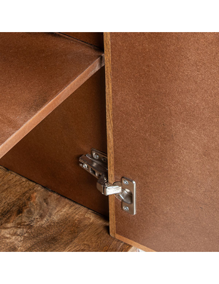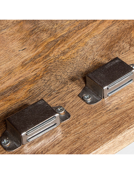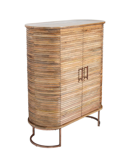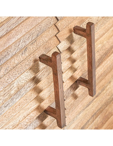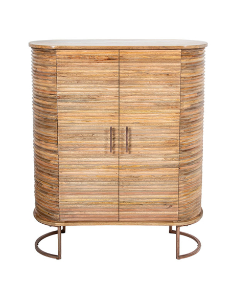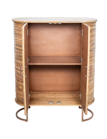 Mueble de entrada Kiger alto, construido con madera de mango de alta calidad, es una pieza que combina elegancia y funcionalidad. Las patas de metal curvas colocadas en los laterales proporcionan una base estable y un diseño moderno. Las dos puertas están adornadas con varillas horizontales en el frente y los laterales, realzando el acabado natural de la madera. Los tiradores verticales de metal y las puertas con bisagras metálicas y cerramiento imantado aseguran un acceso fácil y seguro a los estantes internos, ofreciendo un amplio espacio de almacenamiento. Perfecto para cualquier hogar que busque una combinación de estilo contemporáneo y funcionalidad.