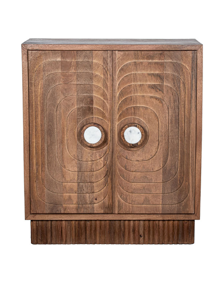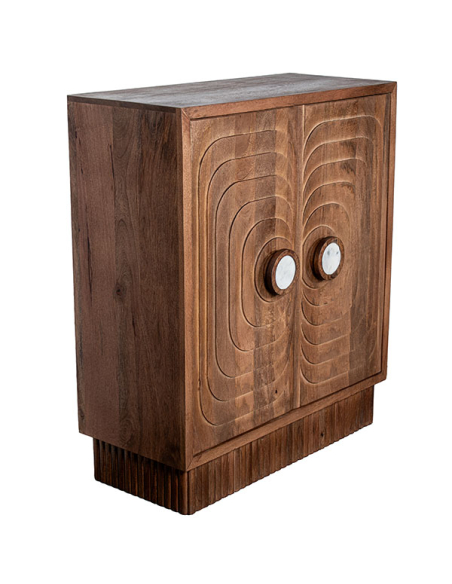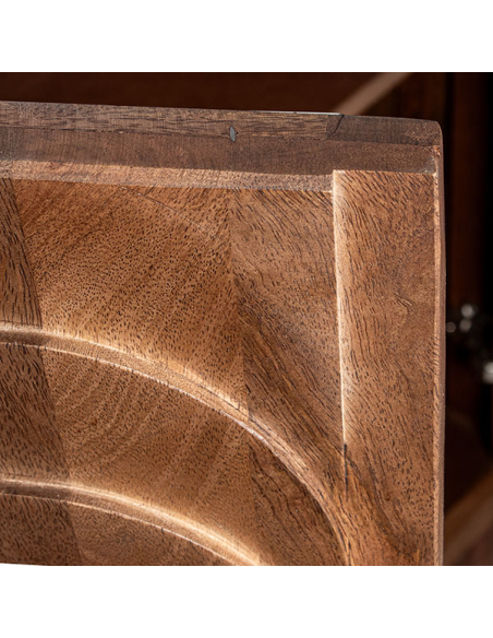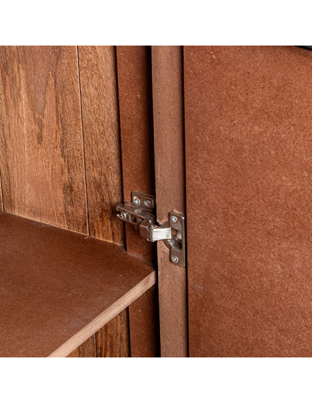 Mueble de entrada Rocky 2 puertas, presenta patas elevadas y un diseño distintivo. Las cuatro puertas, con un relieve de varillas con terminación curva, permiten ver las hermosas vetas de la madera en colores marrones y rojizos. Los tiradores verticales de metal dorado y las puertas con bisagras metálicas y cerramiento imantado ofrecen un acceso fácil y seguro a los estantes internos, proporcionando un amplio espacio de almacenamiento. Este mueble combina funcionalidad con un diseño rústico y elegante, haciendo de él una pieza central en cualquier hogar.