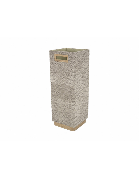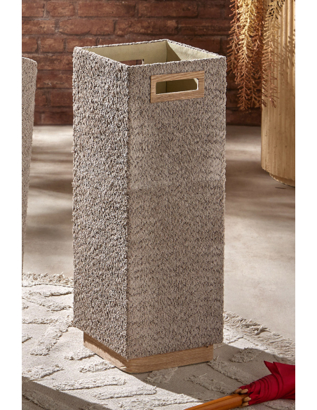Paragüero rizo suave topo y madera, es una solución elegante y práctica para mantener tus paraguas organizados. Con una base cuadrada de madera que proporciona estabilidad y un toque de calidez, su estructura tapizada en textil añade un acabado sofisticado que se adapta a diversos estilos decorativos. La manija en la parte superior facilita su transporte y reubicación, permitiéndote moverlo sin esfuerzo según lo necesites. Ideal para entradas o pasillos, este paragüero no solo cumple con su función, sino que también actúa como un atractivo elemento decorativo en tu hogar.