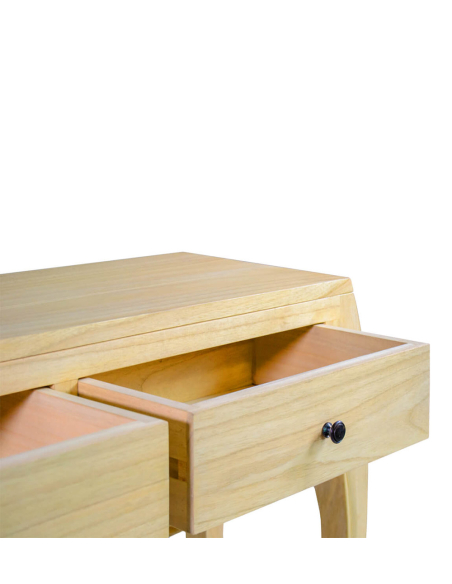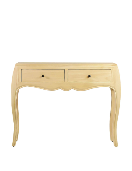 Consola Ainsa 2 cajones, se destaca por su diseño clásico y detalles refinados. Sus dos cajones frontales, con tiradores en un tono contrastante, ofrecen espacio de almacenamiento práctico y discreto. Los detalles curvos en los laterales y debajo de los cajones aportan un toque sofisticado, realzando el encanto de esta pieza. Las patas altas y curvas le otorgan una silueta estilizada que se adapta perfectamente a entradas, salones o dormitorios, combinando funcionalidad con un diseño atemporal. Ideal para quienes buscan añadir elegancia y practicidad a su decoración.