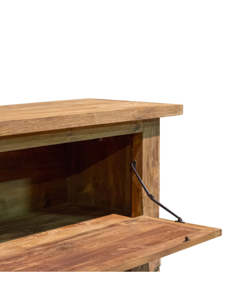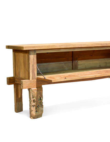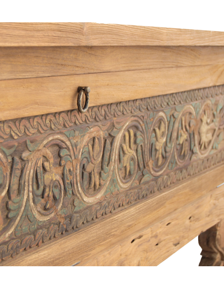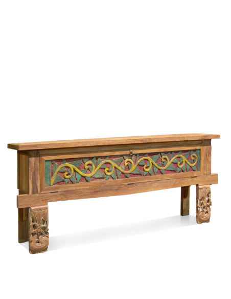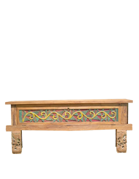 Consola Mérida teka reciclada 1 puerta A, destaca por su diseño elegante y robusto, ideal para darle un toque sofisticado a cualquier entrada o sala. Sus patas altas y talladas aportan un aire clásico y refinado, mientras que el frente, con tapa y detalles calados pintados a mano en colores, crea un contraste visual impresionante. El tirador de metal dorado complementa perfectamente el estilo, añadiendo un toque de lujo. Los laterales reforzados y los herrajes de metal aseguran una gran durabilidad, haciendo de esta consola una pieza resistente y funcional. Perfecta para quienes buscan una pieza única y de alta calidad en su hogar.
