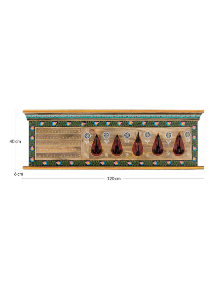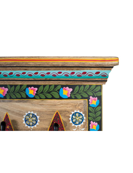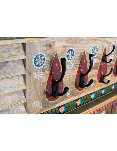 Perchero floral rectangular, elaborado en madera de mango, con un elegante formato rectangular que combina funcionalidad y arte. Este perchero cuenta con 4 ganchos triples de metal negro y 2 ganchos pequeños simples, ofreciendo amplio espacio para colgar abrigos, sombreros o accesorios. Toda la superficie está decorada con motivos florales orientales pintados a mano, lo que le da un toque único y sofisticado, perfecto para añadir carácter y estilo a cualquier espacio. Su diseño rústico y detallado, junto con la calidad de la madera de mango, convierte a este perchero en una pieza funcional y decorativa para tu hogar.