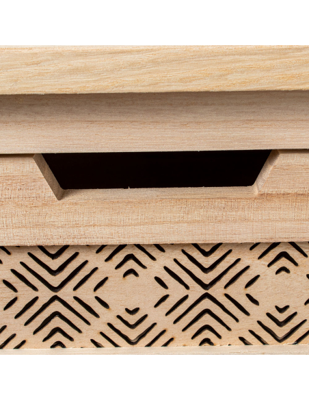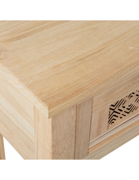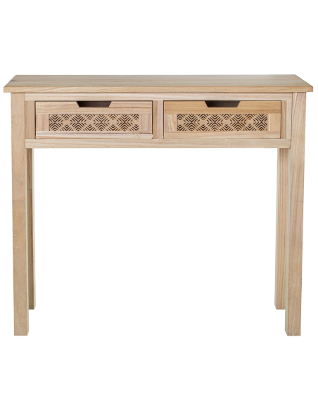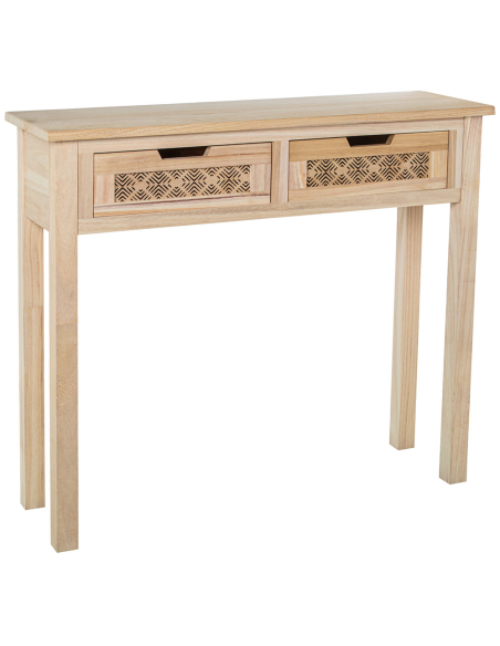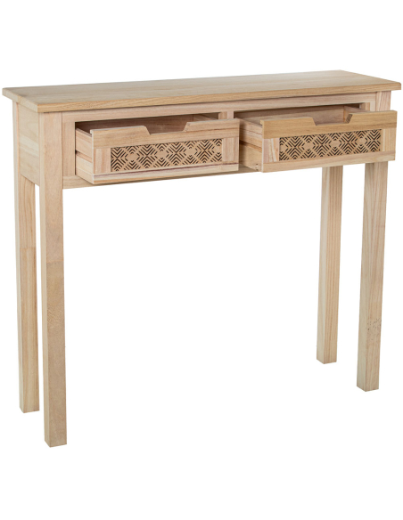 Consola de entrada Sissi 2 cajones, construida con madera natural, su diseño minimalista resalta las líneas limpias y una estética atemporal que se adapta a cualquier estilo decorativo. Ideal para recibidores, pasillos o incluso salones, esta pieza no solo aporta un toque decorativo al espacio, sino que también cumple una función práctica. Los dos cajones espaciosos son ideales para guardar llaves, cartas, o cualquier accesorio que necesites tener al alcance de la mano, mientras que su superficie superior es perfecta para colocar adornos, jarrones o fotografías familiares. Su tamaño compacto permite aprovechar espacios pequeños, combinando utilidad con estilo.
