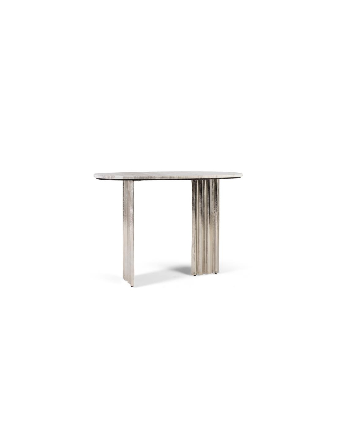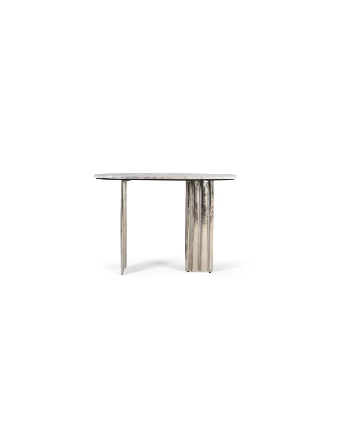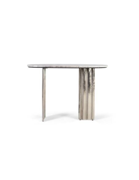 Consola Piedra Ovalada, aporta un punto de elegancia atemporal al recibidor o al pasillo gracias a su sobre oval de mármol natural gris veteado, con cantos suavemente redondeados que realzan el dibujo único de cada pieza. La base de aluminio con líneas acanaladas ofrece estabilidad y un aspecto ligero y contemporáneo, perfecto para interiores modernos, art déco o minimalistas. Su combinación de mármol y aluminio facilita la limpieza diaria (paño suave ligeramente humedecido; evitar productos ácidos o abrasivos) y garantiza durabilidad en uso interior. Pieza ideal como consola de entrada, tras un sofá o bajo un espejo, destaca por su acabado neutro que combina con madera clara, negro o latón. No requiere montaje, llega lista para colocar y disfrutar.