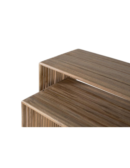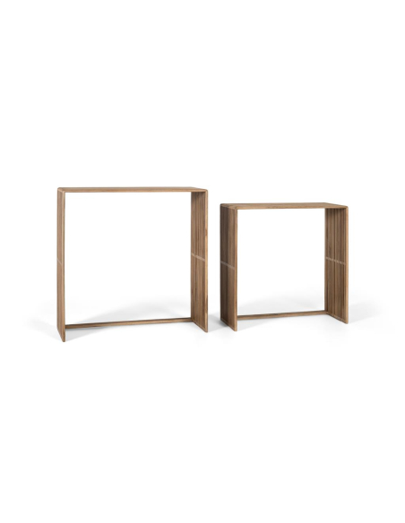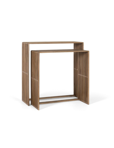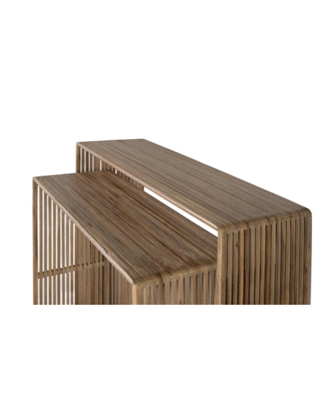 Set 2 consolas recibidor Aria de líneas puras que se encastran entre sí para ahorrar espacio cuando lo necesitas. La teca reciclada en acabado natural luce sus vetas y el lateral listonado típico de la serie Aria, aportando textura y calidez en pasillos, livings o estudios. Su perfil delgado y la geometría en “U” facilitan combinar con espejos, cestos o lámparas sin recargar. Usa ambas como dupla de exhibición o sepáralas: una en el hall, otra detrás del sofá. Diseño versátil que ordena y viste de forma elegante.