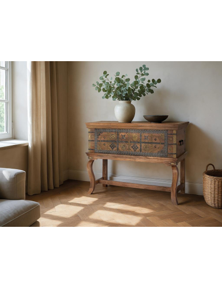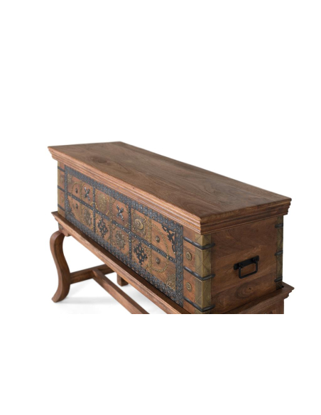 Consola recibidor estilo baúl, inspirada en los antiguos cofres de viaje, esta consola recibidor sorprende con su tapa abatible y estructura elevada. La madera de mango en tono natural aporta calidez, mientras los detalles metálicos y la base de líneas curvas suman carácter vintage. Úsala en el hall para guardar bufandas, bolsos y correas, o en el living como bar oculto para copas y botellas. También es una gran aliada en el dormitorio como pie de cama con espacio extra para mantas. Un objeto con historia que organiza y decora a la vez.