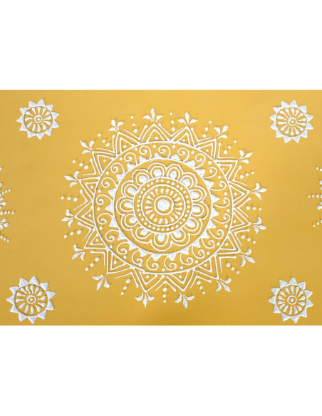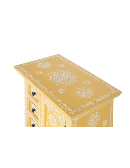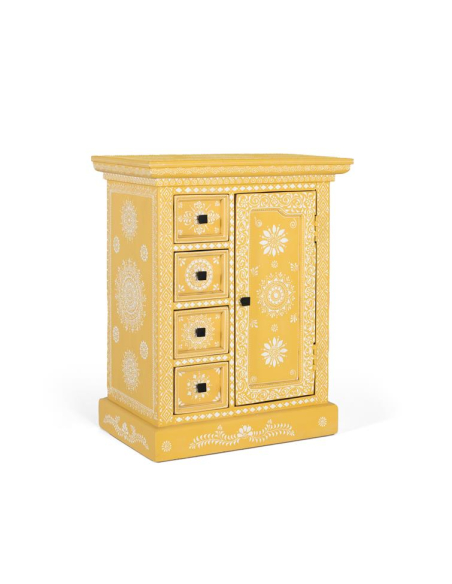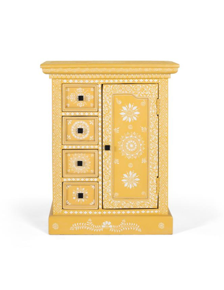 Mueble recibidor Fantasía amarillo, este mueble auxiliar en amarillo con detalles blancos luce tres cajones superiores y uno inferior junto a una puerta con estante, el formato ideal para tener a mano llaves, papeles y accesorios al entrar. La pintura artesanal de inspiración folk añade encanto vintage, mientras la madera de mango asegura solidez para el uso diario. Úsalo en recibidores y pasillos estrechos, como mesita auxiliar en el living o como mini aparador en el comedor. Su color vibrante actúa como acento decorativo que alegra y ordena en un solo gesto.
