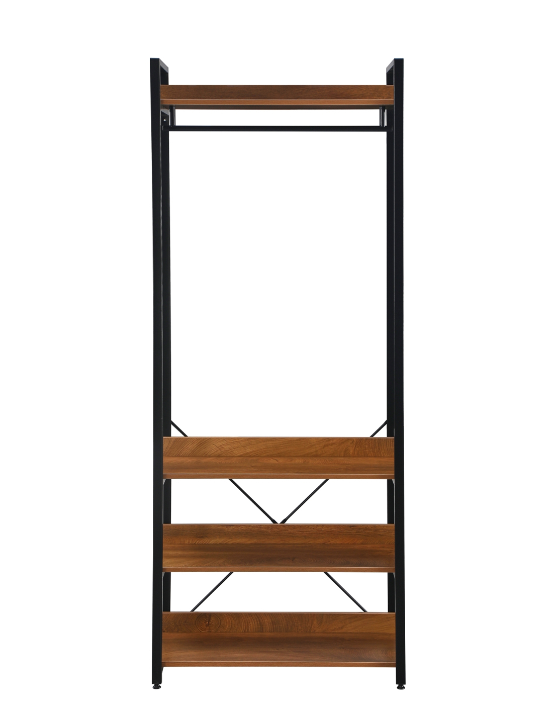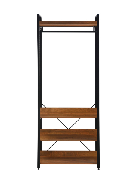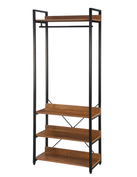 Estantería Nicodemus 4 baldas y barra de colgar, con estructura metálica y estantes de melamina en acabado madera, de 200 cm de altura, que combina cuatro baldas para almacenaje y una barra para ropa. Su diseño abierto facilita el acceso y la organización, convirtiéndose en una opción ideal tanto para dormitorios como para vestidores o incluso espacios de trabajo creativos. La mezcla de metal y madera le otorga un estilo industrial muy actual, aportando funcionalidad y carácter decorativo al mismo tiempo. Es perfecta para mantener ordenados libros, ropa, accesorios u objetos decorativos, ofreciendo una pieza resistente y versátil que se adapta fácilmente a distintos usos y ambientes.
