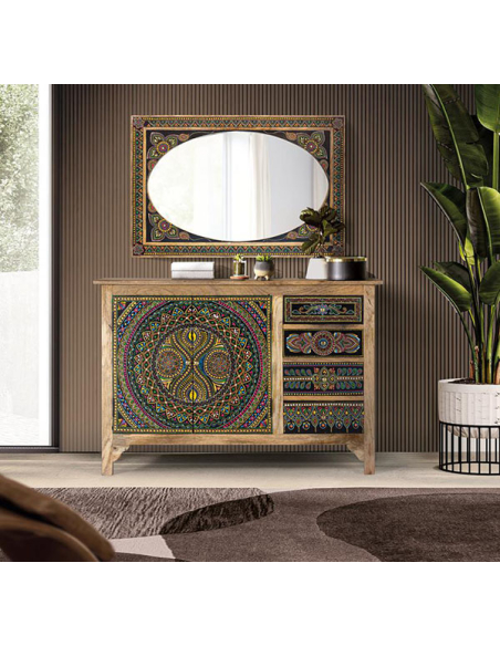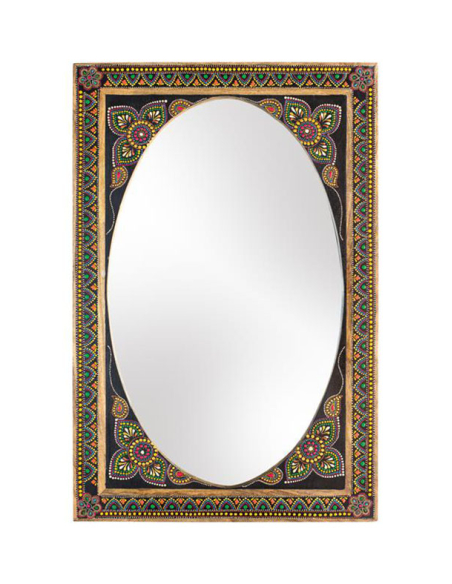 Espejo Indo detalles pintados a mano, esta hermosa pieza de formato oval con marco rectangular posee un intrincado diseño pintado a mano. Este espejo dará brillo y luminosidad a tu hogar sin pasar desapercibido, ideal para decoraciones que necesitan un toque de color y alegría. Gracias a que sus colores son sobrios a pesar del detalle que posee la pintura es un espejo fácilmente adaptable a distintos estilos de decoración.