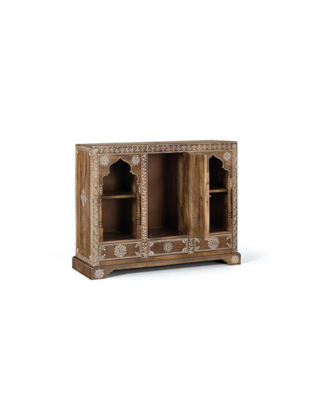 Consola Orienta 1 puerta detalles pintados a mano, una pieza impresionante que añadirá elegancia y funcionalidad a tu hogar. Con tres cajones inferiores, una puerta central y dos estantes en cada lateral, ofrece amplio espacio de almacenamiento para tus pertenencias. Los detalles pintados a mano en color blanco agregan un toque de encanto y distinción. Perfecta para el recibidor o el salón, esta consola es una combinación perfecta de estilo y practicidad.