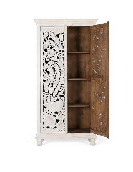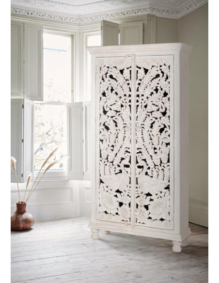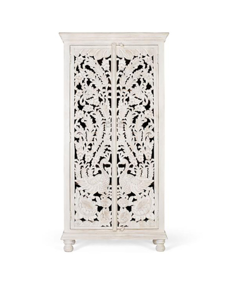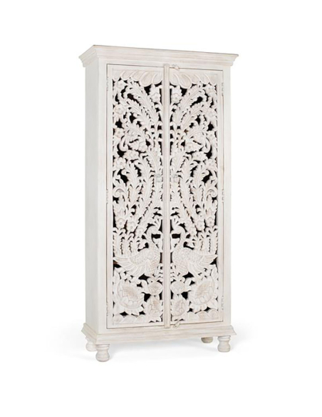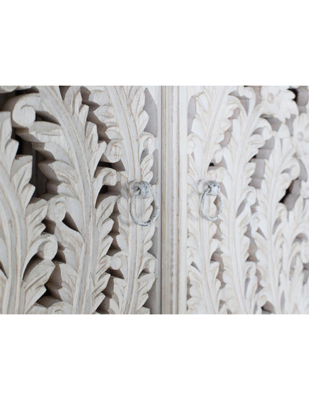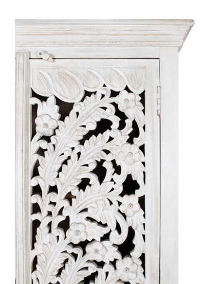 Armario calado hojas y flores, sus puertas caladas con delicadas hojas y flores crean una sensación de ligereza y frescura, mientras que los cuatro estantes internos ofrecen un amplio espacio para organizar tus pertenencias. Las patas torneadas, las bisagras de metal y los tiradores metálicos añaden un toque de elegancia y durabilidad a esta pieza. Con un acabado blanco que ilumina cualquier espacio, este armario es perfecto para añadir un toque de estilo a tu dormitorio o sala de estar.
