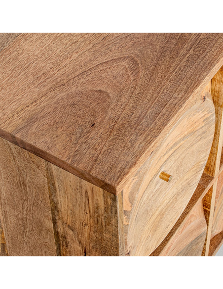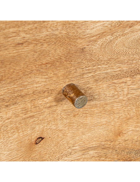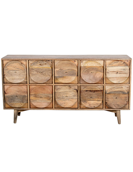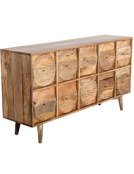 Aparador 10 cajones Vyatka, construido con madera de mango combina funcionalidad y estilo con sus patas elevadas de diseño mid-century y sus diez cajones calados, cada uno con un círculo en relieve y pequeños tiradores de metal. La madera de mango, que deja ver sus vetas a simple vista, se presenta en colores naturales con tonos marrones y rojizos, aportando una calidez y elegancia únicas a cualquier espacio. Perfecto para añadir un toque de sofisticación y almacenamiento práctico a tu hogar, este aparador se adapta a diferentes estilos de decoración, desde rústico hasta moderno.