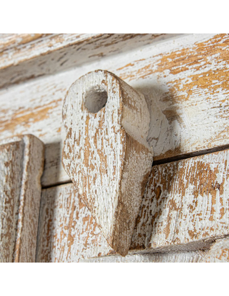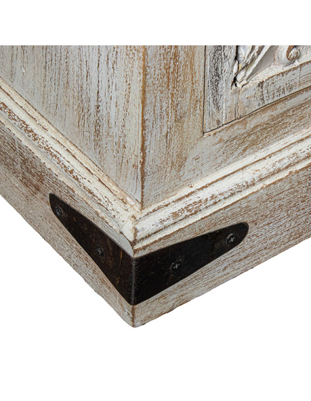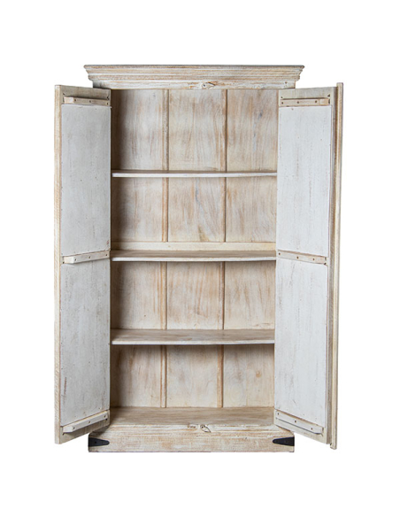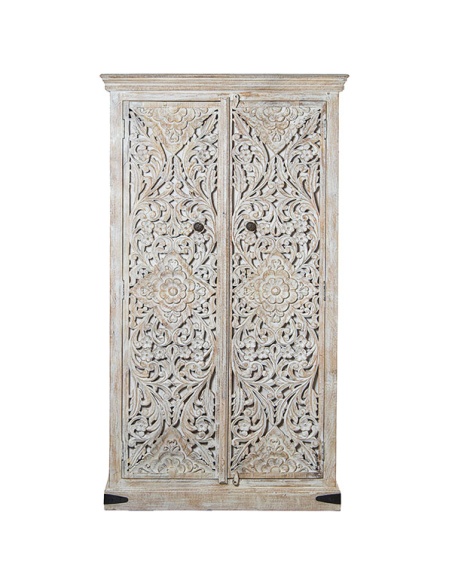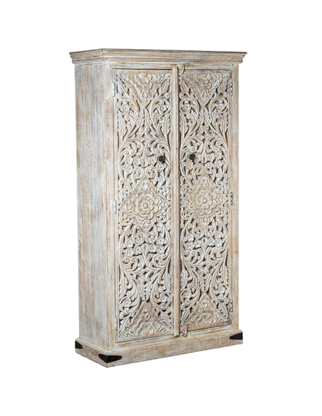 Armario Kathiawari dos puertas caladas, construido con madera de mango destaca por su base entera elevada, proporcionando una estructura robusta y sofisticada. Las dos puertas están adornadas con calados florales en toda su superficie, combinando un encantador color natural con detalles en blanco que resaltan su diseño artesanal. Los tiradores redondos de metal añaden un toque de elegancia, facilitando la apertura de las puertas. En su interior, cada puerta revela estantes internos que ofrecen un generoso espacio de almacenamiento. Los detalles metálicos en los laterales de la base aportan un contraste moderno y atractivo. Perfecto para añadir un toque de sofisticación y funcionalidad a cualquier habitación, este armario es ideal para quienes buscan una pieza decorativa y práctica que complemente su hogar con estilo.