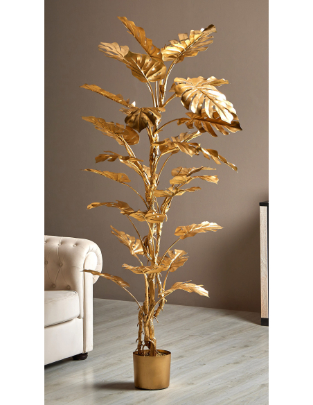 Planta Split philo oro 186 cm, el follaje cuidadosamente distribuido en diferentes direcciones, crea un efecto visual dinámico y cautivador. Su superficie en un radiante color oro añade un toque de glamour y sofisticación, convirtiéndola en el complemento perfecto para cualquier espacio. La elegante maceta cilíndrica en color oro no solo realza su belleza, sino que también aporta un estilo contemporáneo y lujoso. Ideal para salones, oficinas o rincones especiales, esta planta es la opción perfecta para quienes desean incorporar un toque de elegancia sin el esfuerzo de mantener plantas reales.