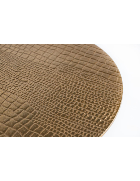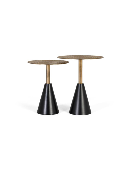 Set de 2 mesas auxiliares Lumina bronce, de diseño moderno y elegante, perfecto para complementar cualquier espacio contemporáneo. Estas mesas cuentan con una estructura de metal resistente, que combina una base cónica en color negro con una columna central en acabado dorado envejecido, añadiendo un toque de sofisticación. Las tapas circulares destacan por su textura decorativa tipo reptil en dorado, que aporta un carácter único y refinado. Su diseño versátil las hace ideales como mesas auxiliares para el salón, el dormitorio o cualquier rincón de tu hogar. Este conjunto es perfecto para quienes buscan funcionalidad sin renunciar al estilo y la modernidad.